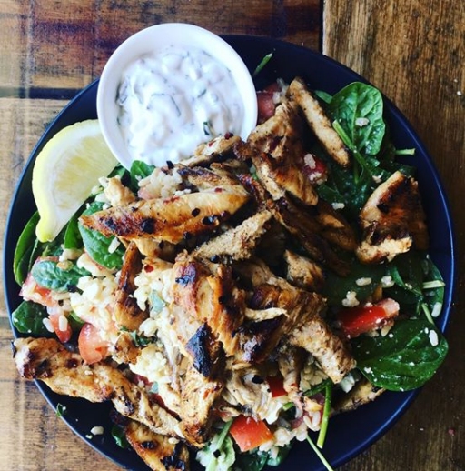 Fresh salad, with spinach, avocado, feta and brown rice, partnered up with our chilli chicken and a dash of tzatziki and a wedge of lemon!